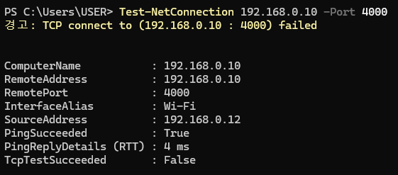 - TcpTestSucceeded : True → Server(192.168.0.10)가 4000번 포트를 열고 있음