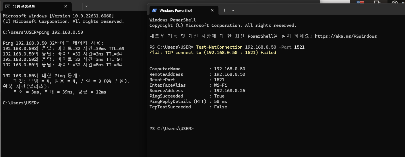 이렇게 하고 다시 파워쉘에서 Test-NetConnection 192.168.0.50 -Port 1521을 해보면