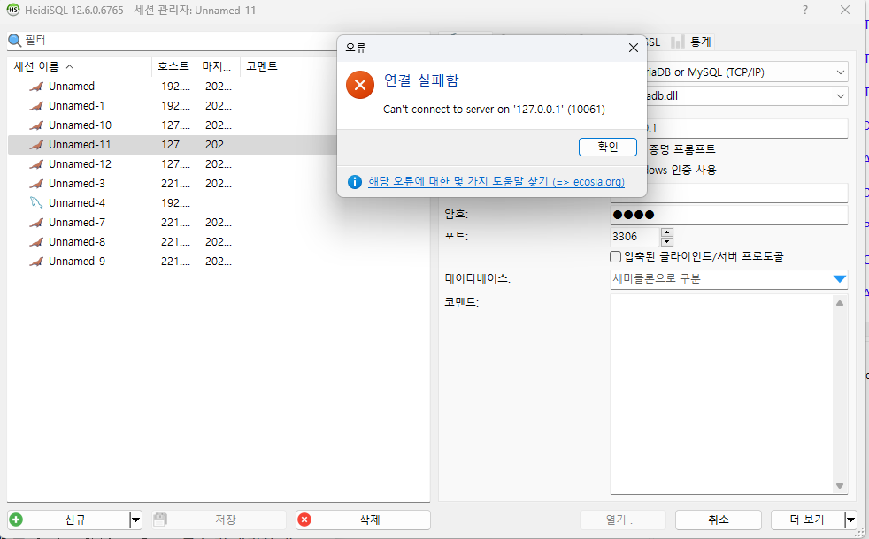 - HeidiSQL 등에서 로컬 DB 접속 불가 (127.0.0.1)