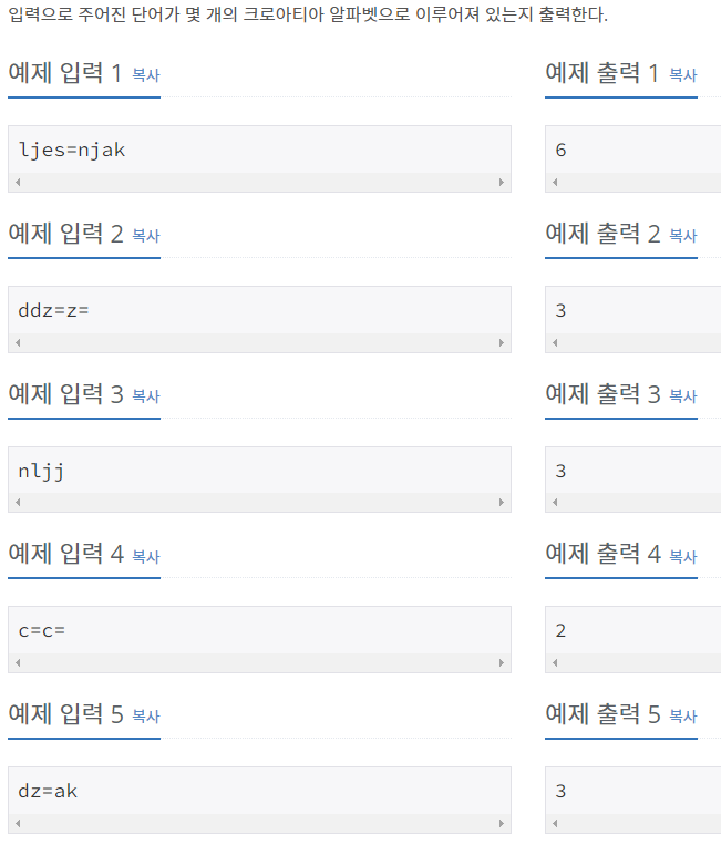 처음엔 문제를 잘못 이해했다. 인풋으로 ljes=njak를 입력할 시< lj, s=, nj> 총 3이 출력이 되는게 아니라 e, a, k까지 6이 출력이 되는거더라.