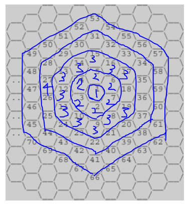 위의 그림과 같이 육각형으로 이루어진 벌집이 있다. 그림에서 보는 바와 같이 중앙의 방 1부터 시작해서 이웃하는 방에 돌아가면서 1씩 증가하는 번호를 주소로 매길 수 있다. 숫자 N이 주어졌
