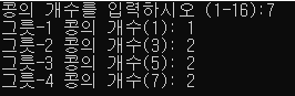 [조건] 콩을 나누어 주는 그릇은 4개이다. 콩의 개수는 1-16개까지로 한정한다.