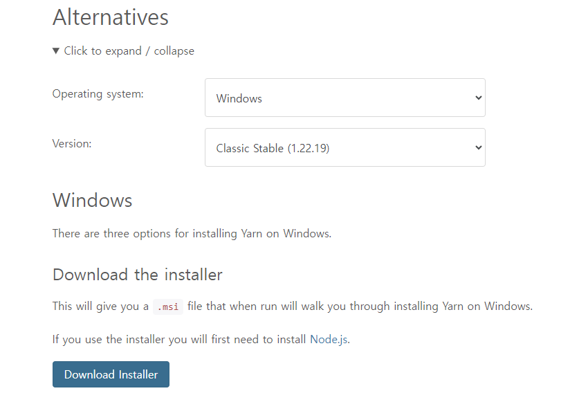 위의 사이트에 들어간다! (https://classic.yarnpkg.com/en/docs/install#windows-stable)